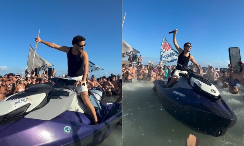DJ Pedro Sampaio se apresenta em jetski durante festa no mar em Maracaípe