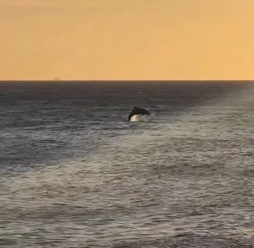 Golfinhos são flagrados no mar do Rio Vermelho durante o pôr do sol