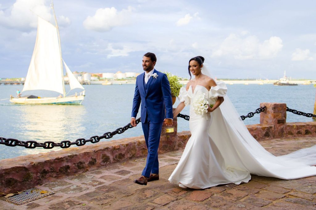 Empresário do setor náutico, Hugo Leonardo construiu sua trajetória profissional conectada ao mar, enquanto Aline Almeida compartilha desse olhar sensível para os símbolos e significados que envolvem a vida e suas escolhas. Juntos, transformaram a saída do casamento em um momento poético, que dialoga com a paisagem natural da Ilha dos Frades e com a cultura da Baía de Todos-os-Santos.