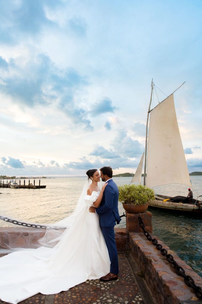 A imagem da embarcação singrando as águas da baía representou, de forma delicada, a ideia de travessia e início de uma nova jornada a dois. Mais do que um gesto estético, a escolha do saveiro — embarcação tradicional e profundamente ligada à cultura baiana — reforçou o vínculo do casal com o mar e com as raízes históricas da navegação local.